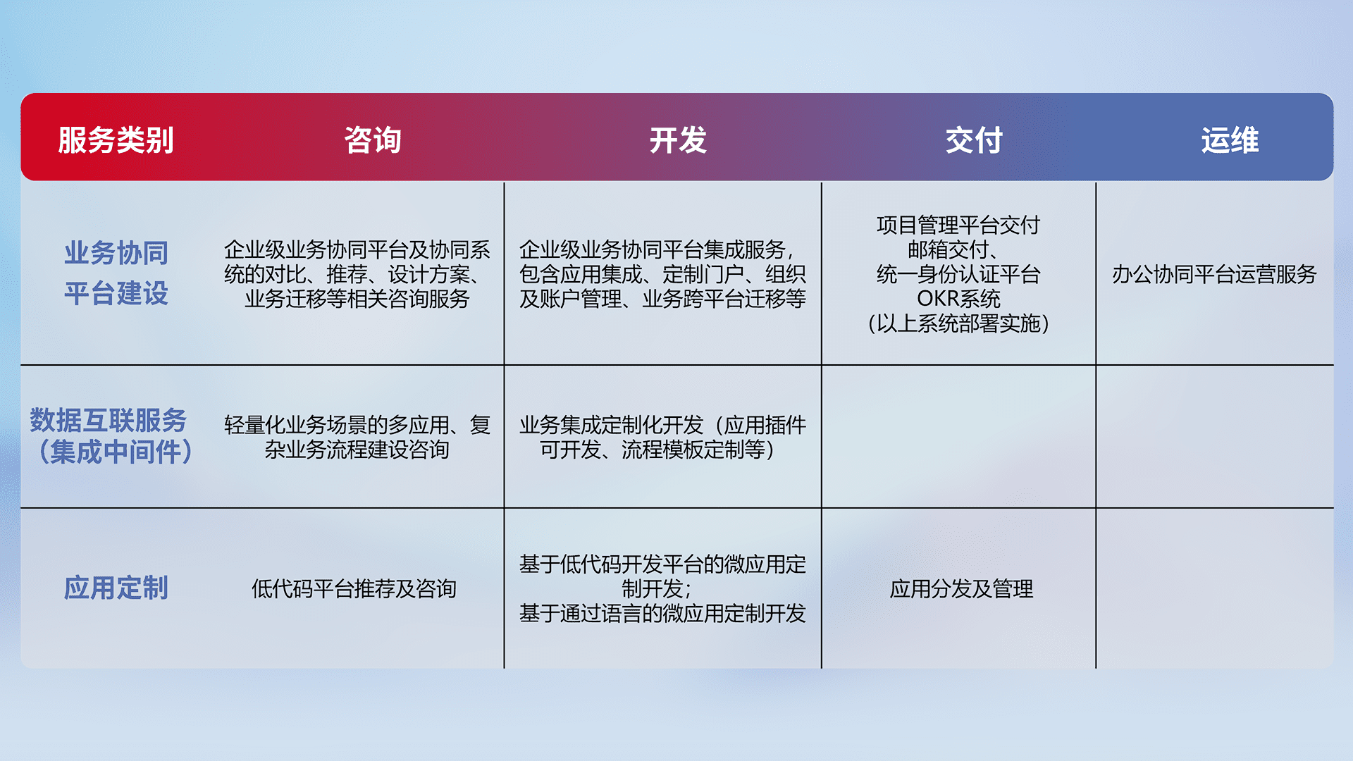 针对钉钉、、、、企微、、IDaas等平台级产品提供产品的规划、、方案、、、、交付、、、、定制化开发等服务,,,实现如统一协同办公、、、智能客户服务、、、、混合会议管理、、、智能数据查询、、、等业务场景,,,实现数字化转型。。